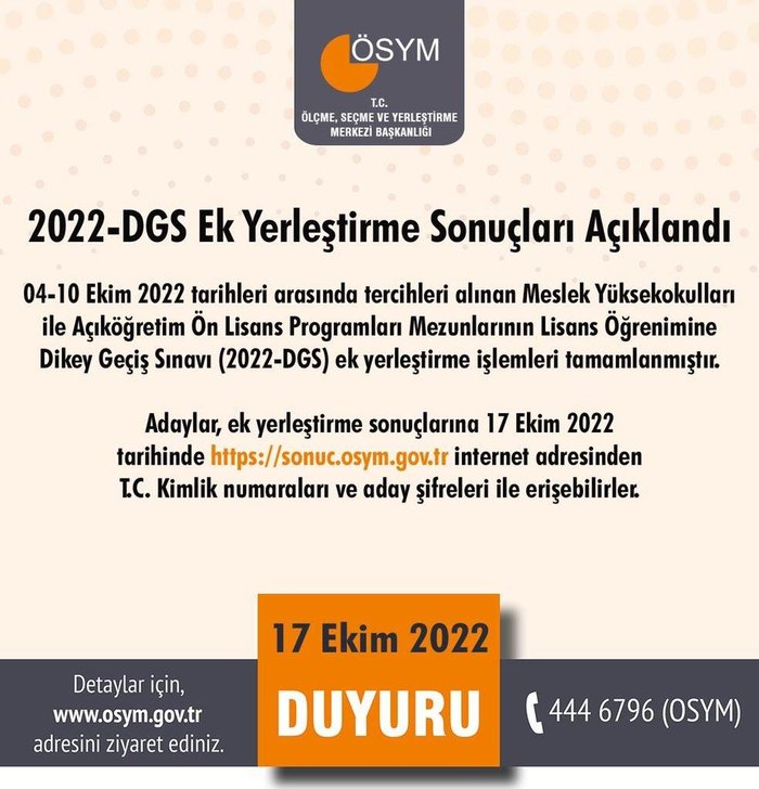 Geçtiğimiz yıl 21 Ekim’de sona eren tercihlerin akabinde 27 Ekim tarihinde sonuçlar erişime açılmıştı. 2022-DGS Ek Yerleştirme tercihleri ise 4-10 Ekim 2022 tarihleri ortasında alındı. Sonuçlar 17 Ekim 2022 Pazartesi günü erişime açıldı.